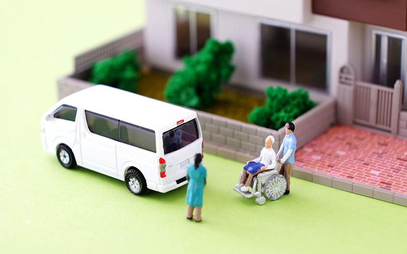 ご自宅の玄関まで車でお迎えにあがります。体の不自由な方のために車イスのまま乗車できるリフト車での送迎も可能です。